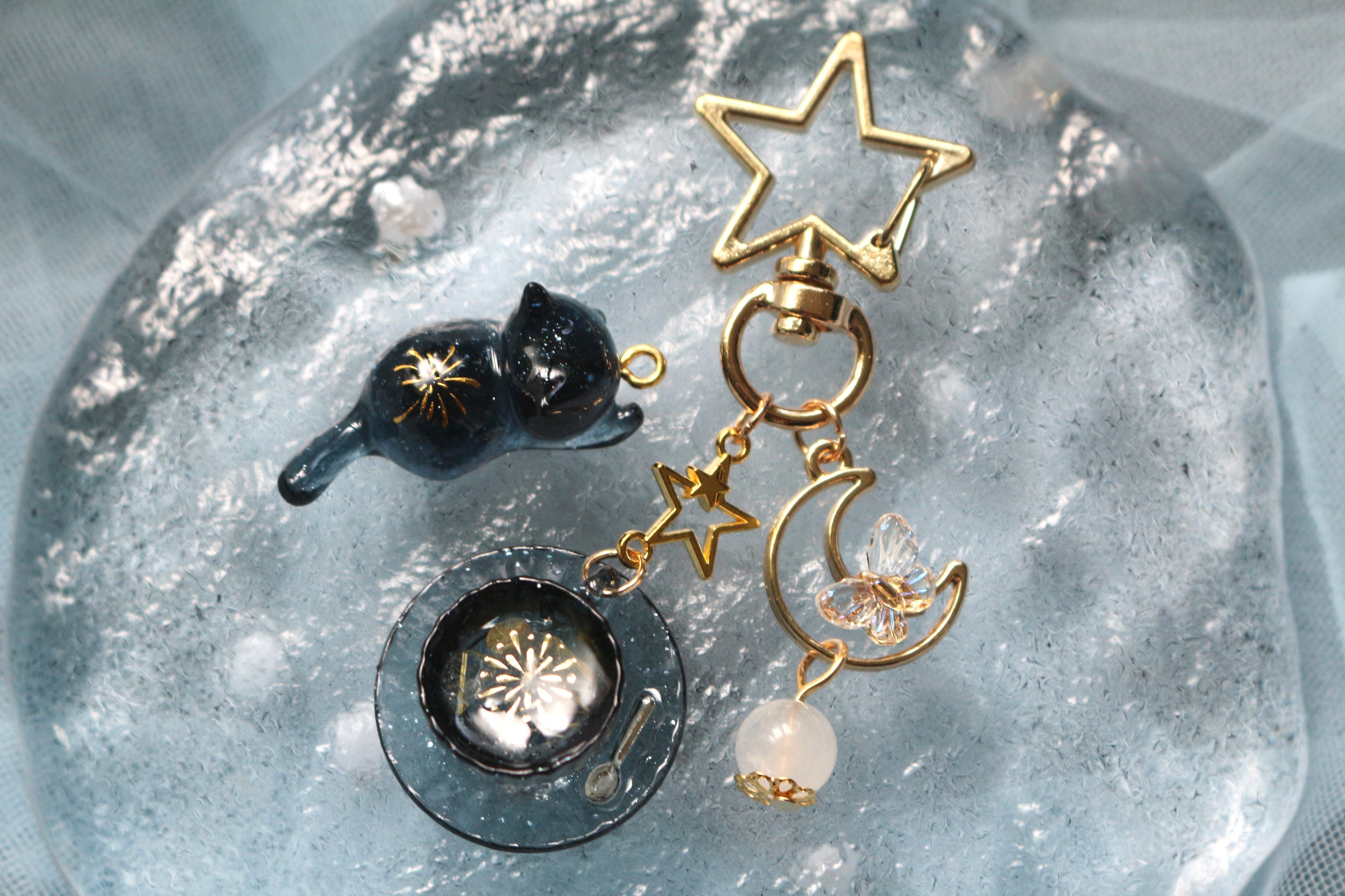 招待された猫ちゃんは茶器と同じ、花火の粉をイメージして全体に煌めかせており、体には一輪の花火が咲き誇ってます。