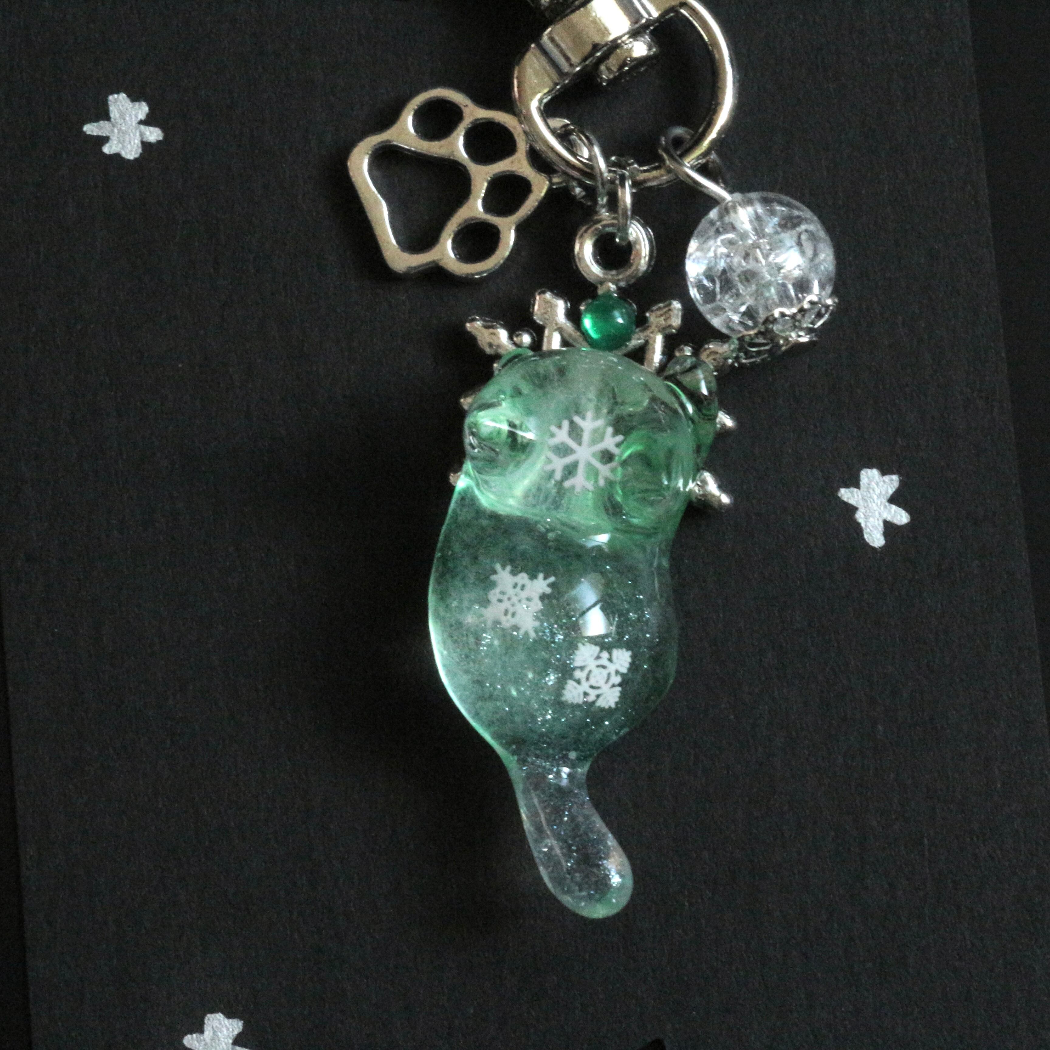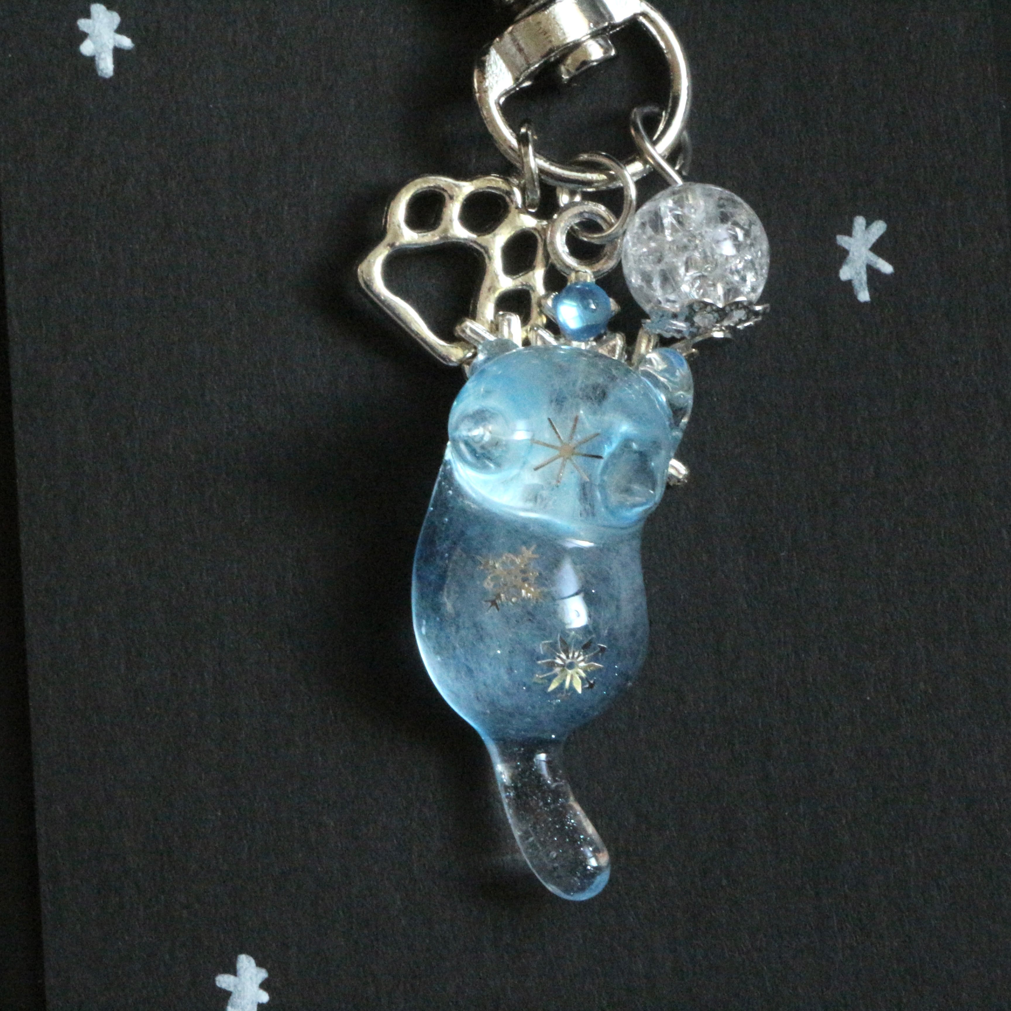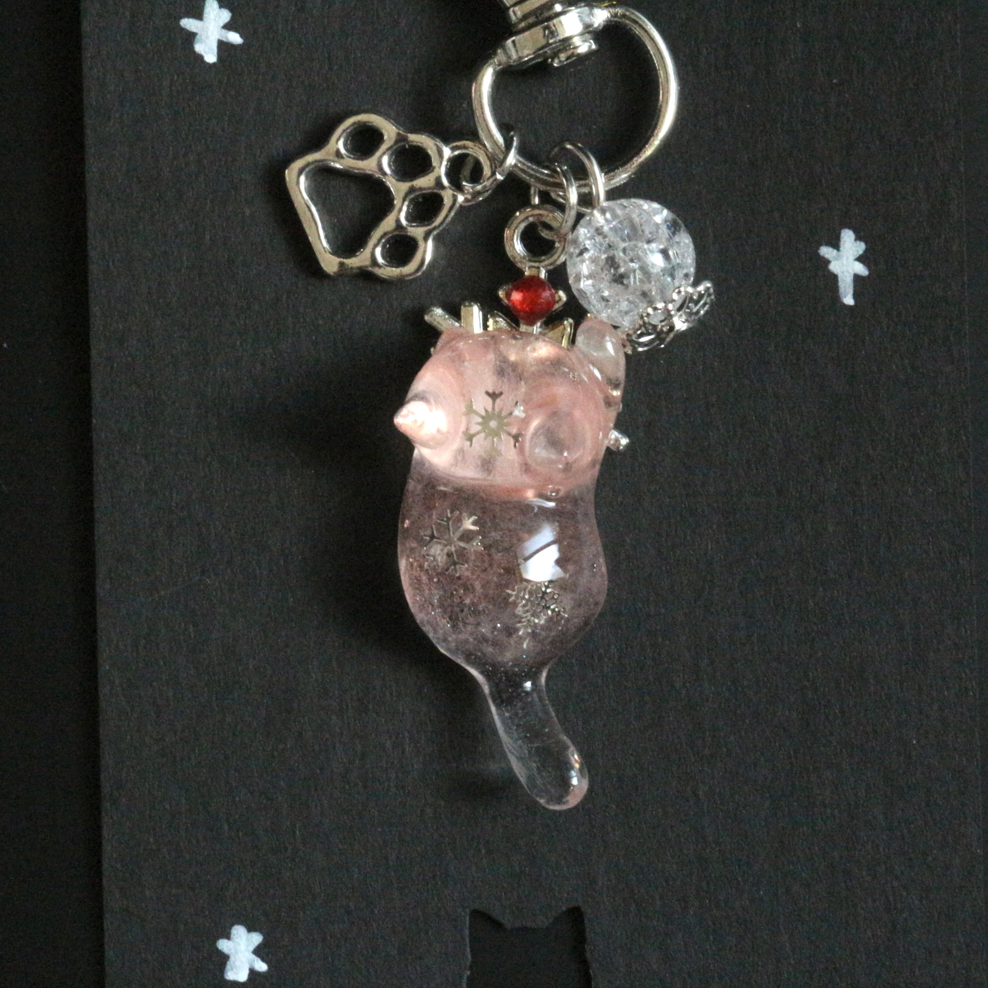 猫ちゃんが掴んでいる雪のチャームや白のクラックビーズで冷たさを表現しております。