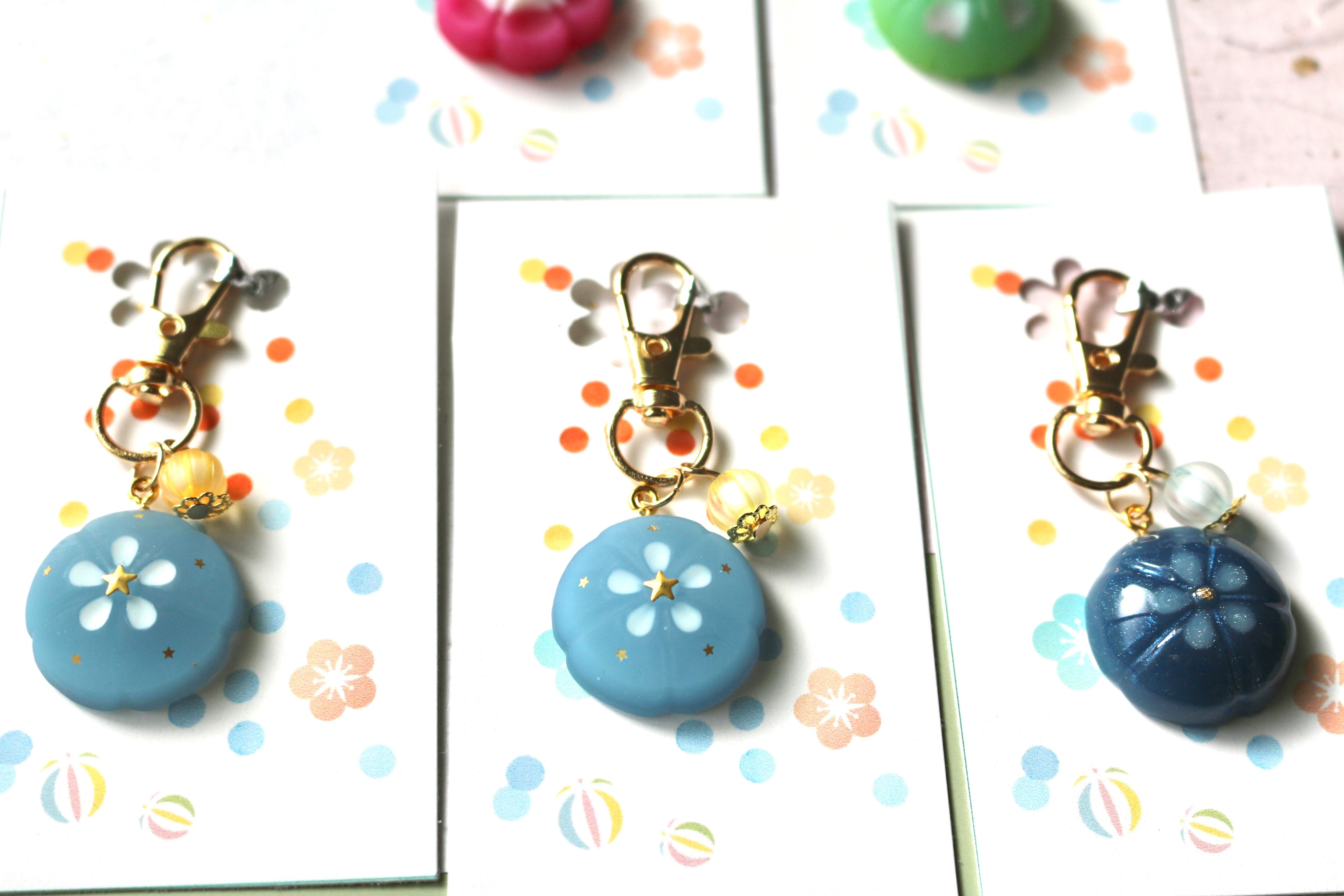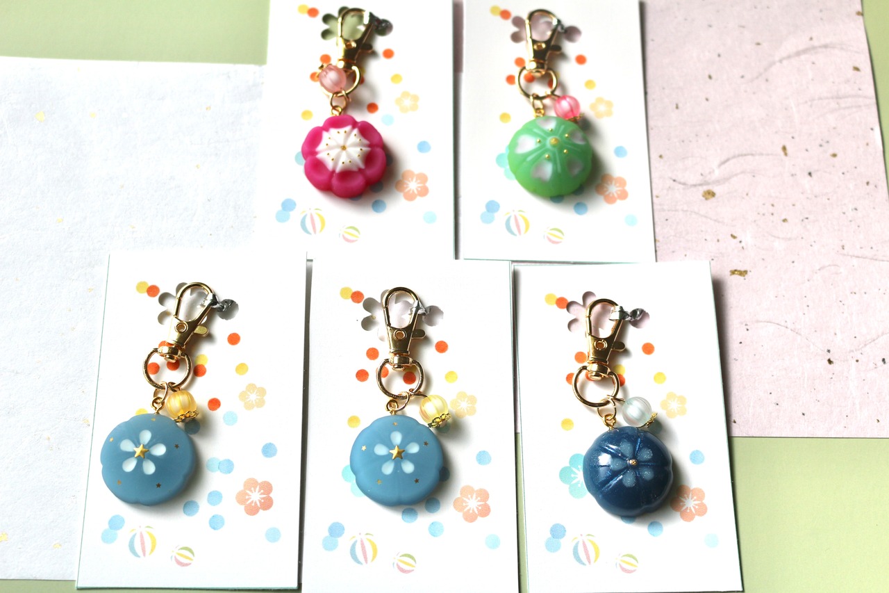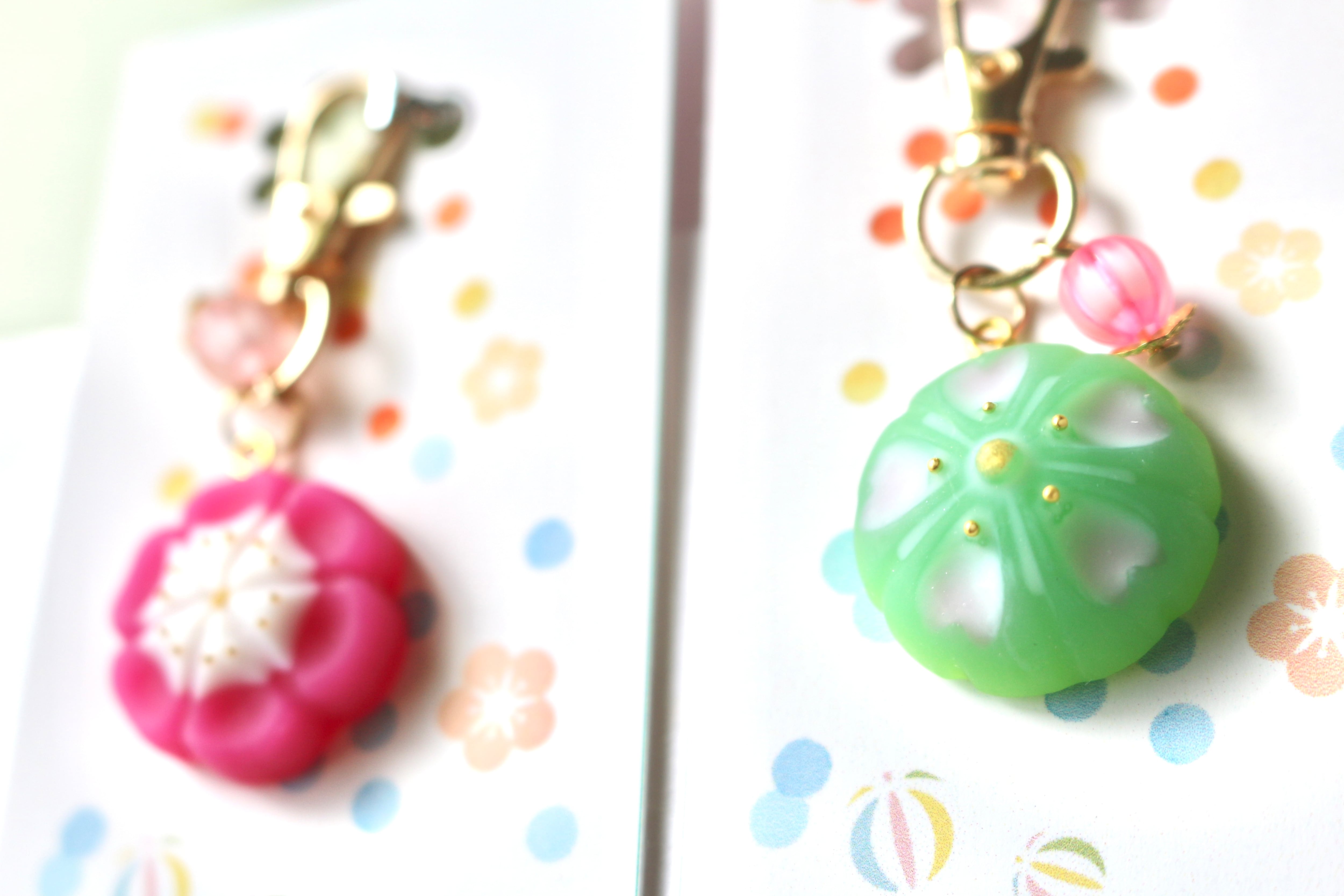 和菓子をモチーフに、レジンでひとつひとつ仕立てたキーホルダーです。
