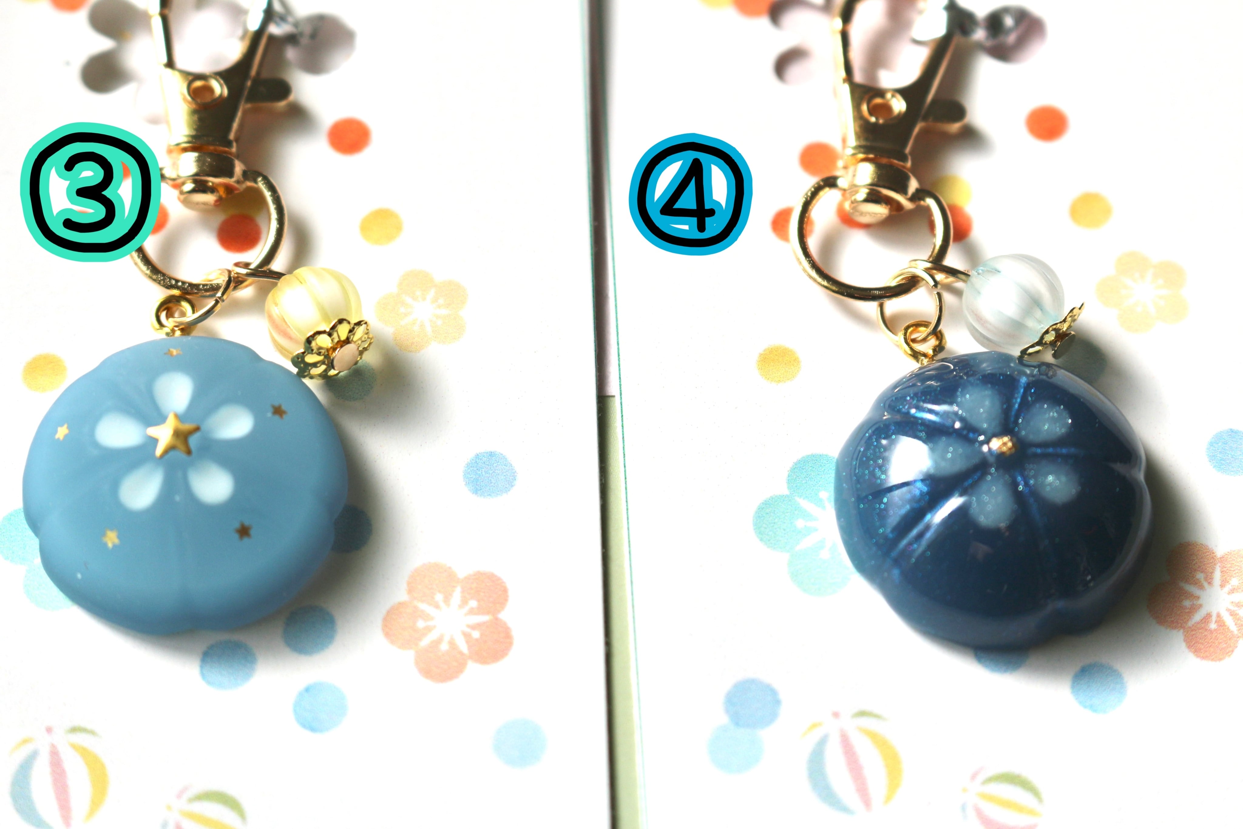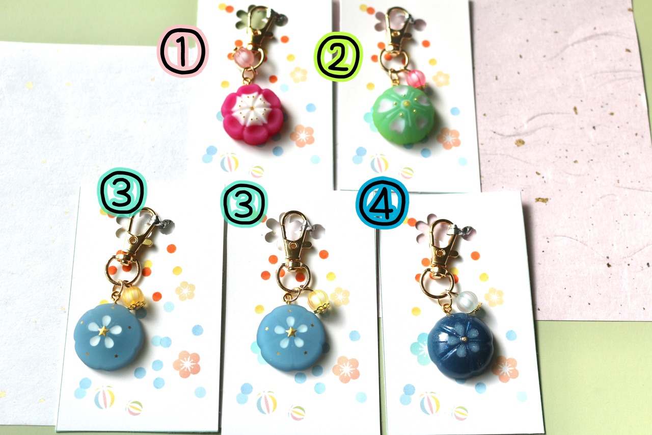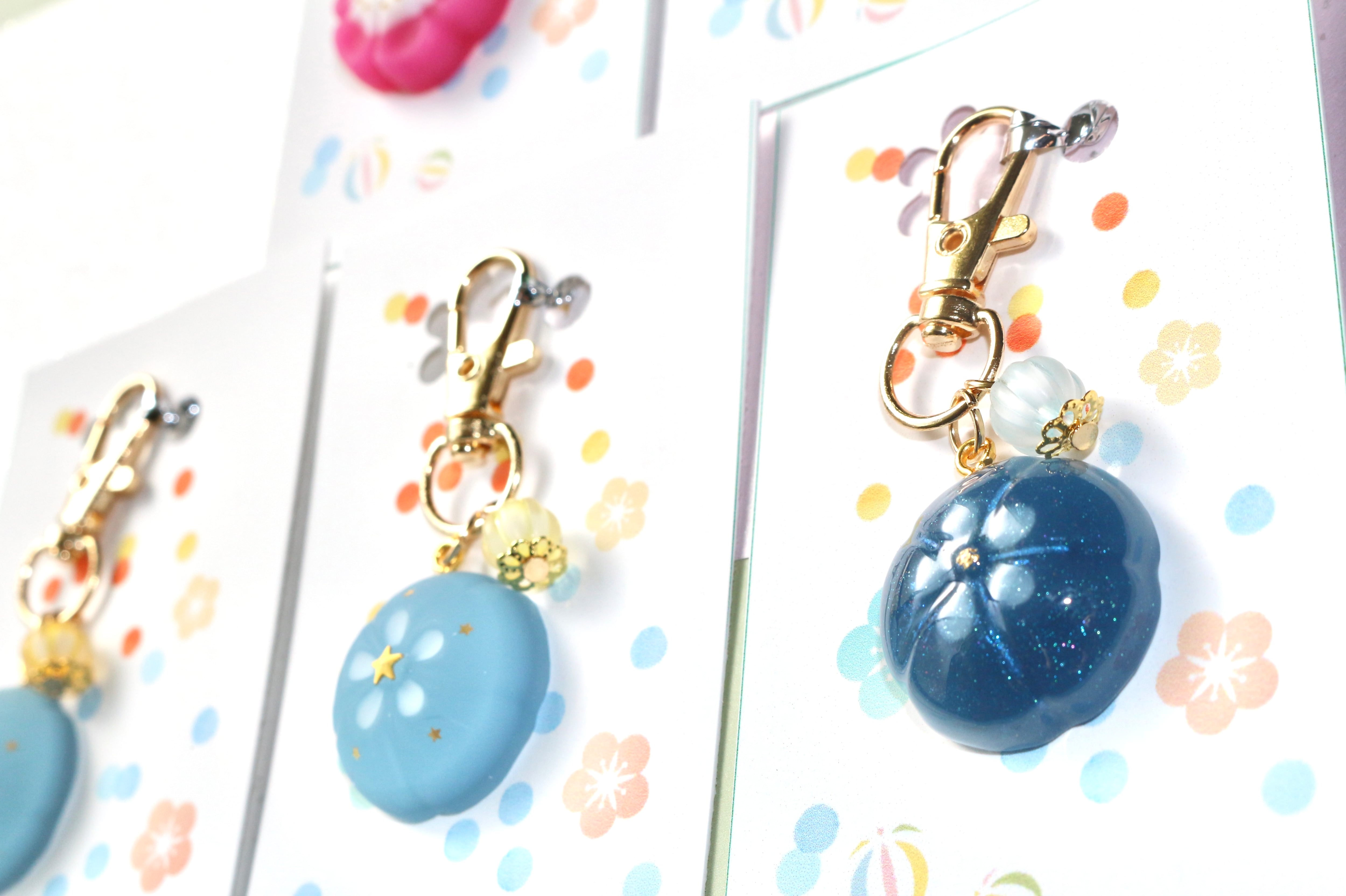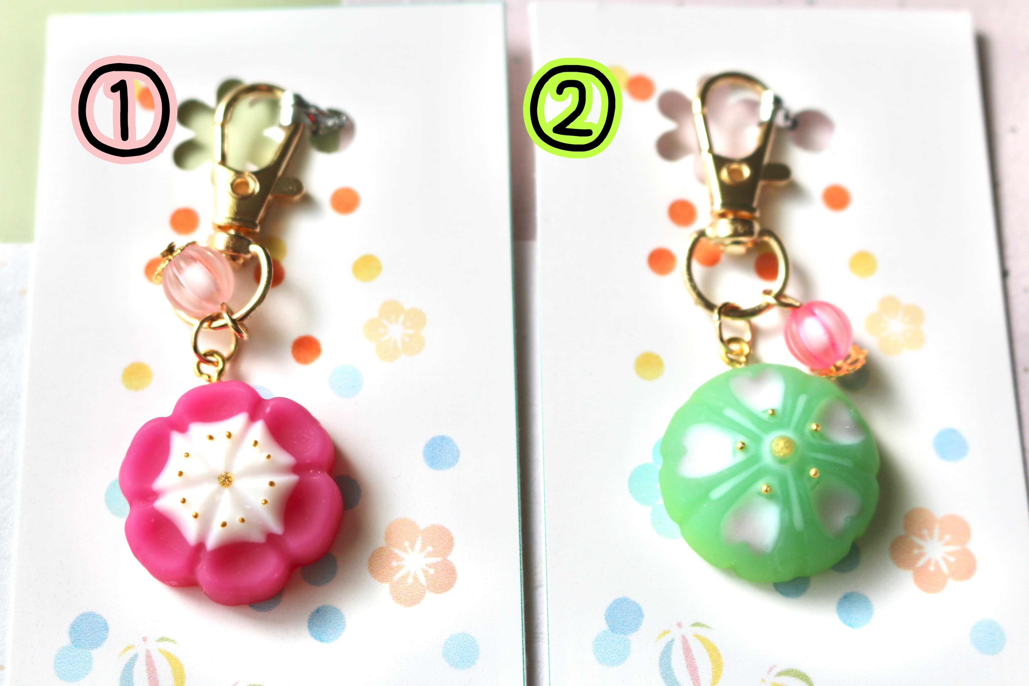 和菓子をモチーフに、レジンでひとつひとつ仕立てたキーホルダーです。