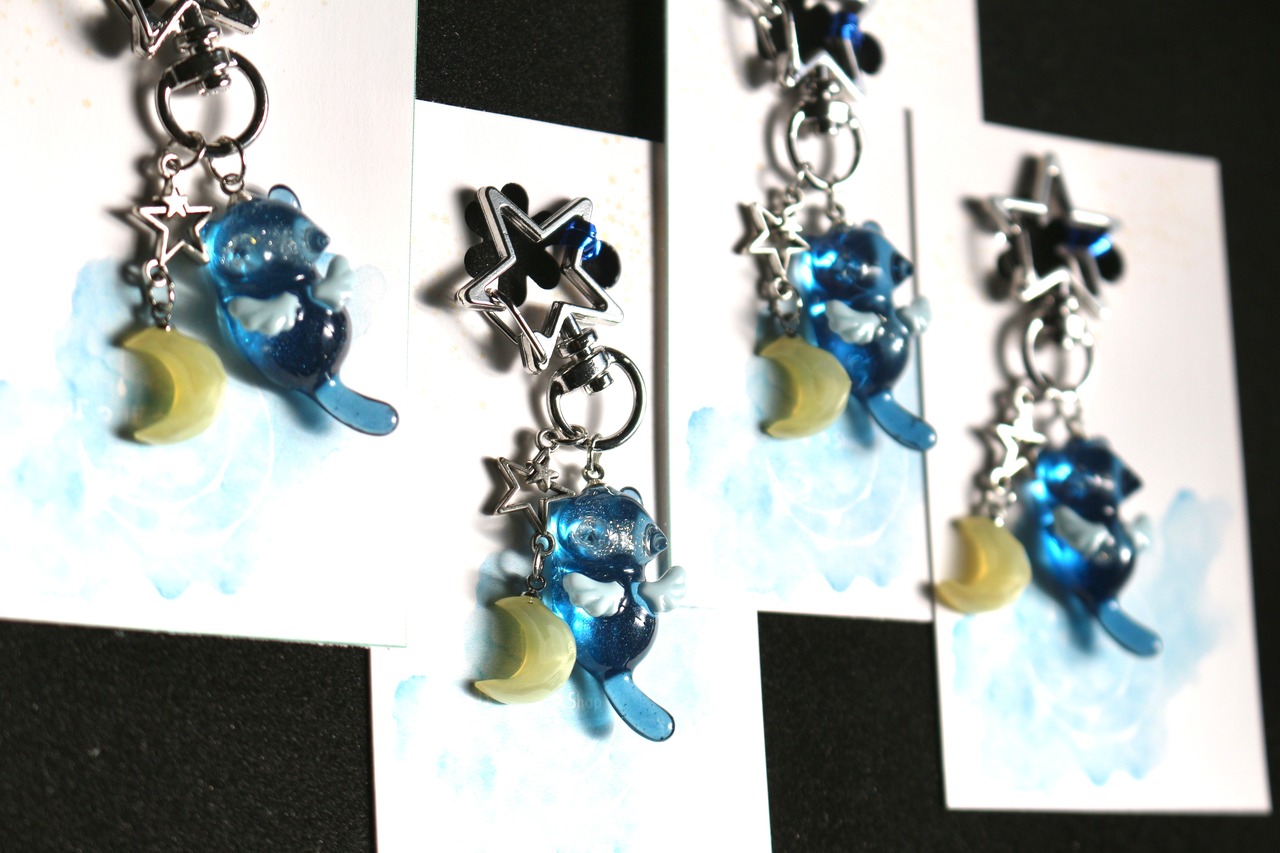 小さなお月様を猫じゃらしにして遊ぶ天使猫ちゃんキーホルダーとなります。